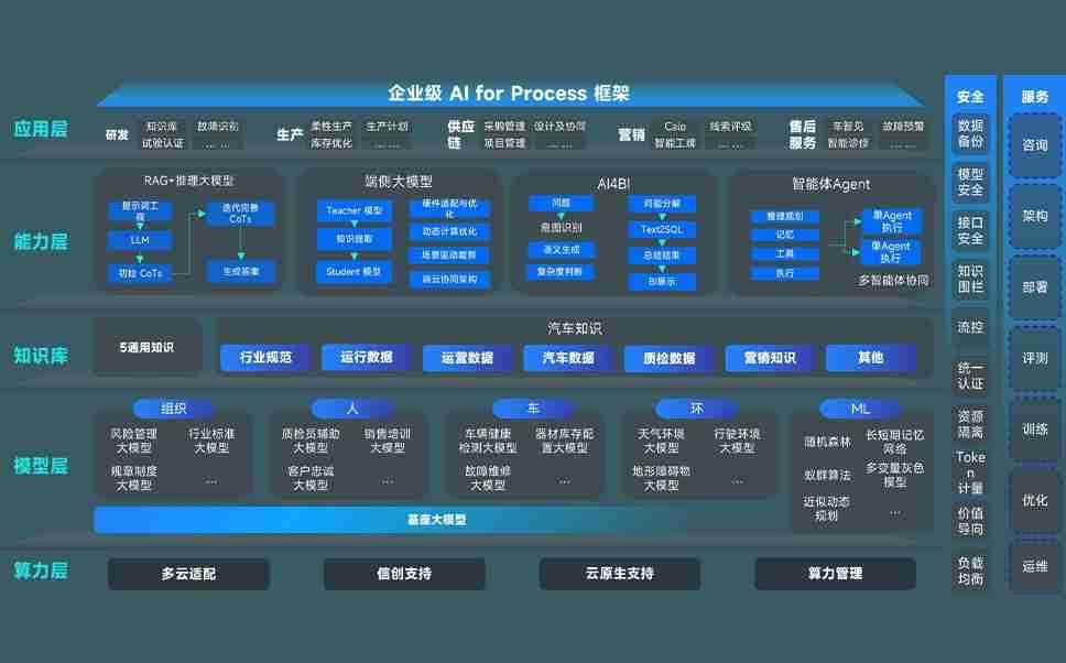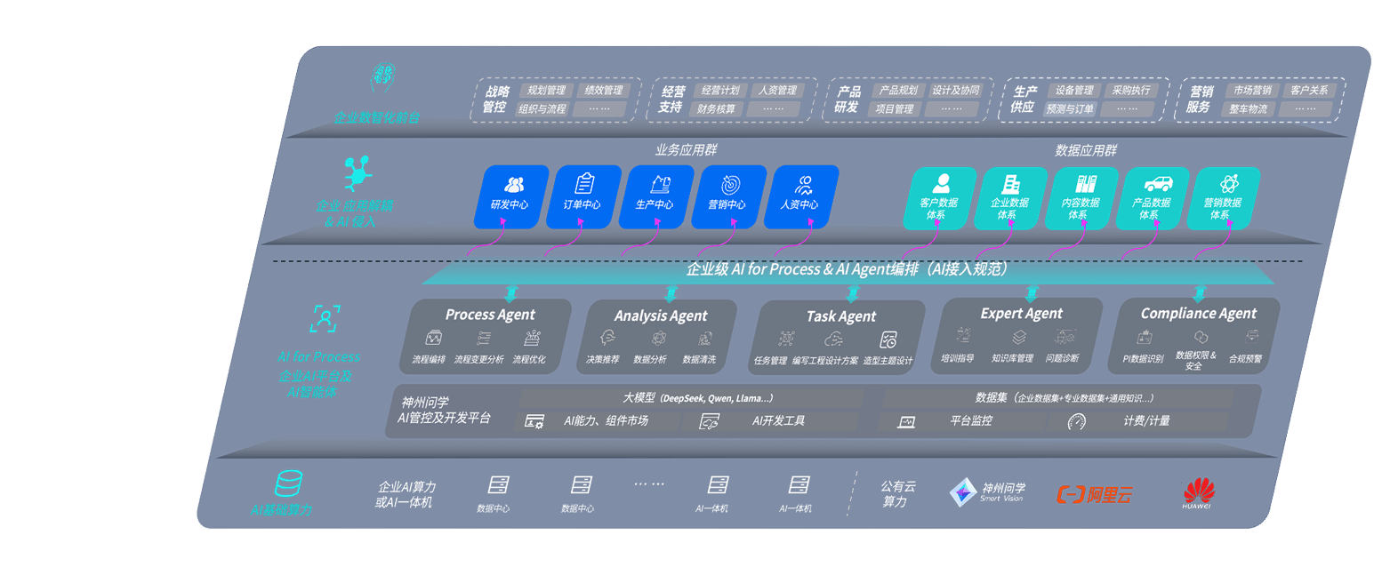 端到端的一站式AI工作空间深度融合了从企业战略规划到日常经营的全流程业务板块,,,,定向解决车企内部领域多、、、部门多、、、链条长、、、、场景碎片化等难题,,支持车企快速构建以AI为核心的生产力写作体系,,,实现任务执行与AI能力的无缝集成与交互