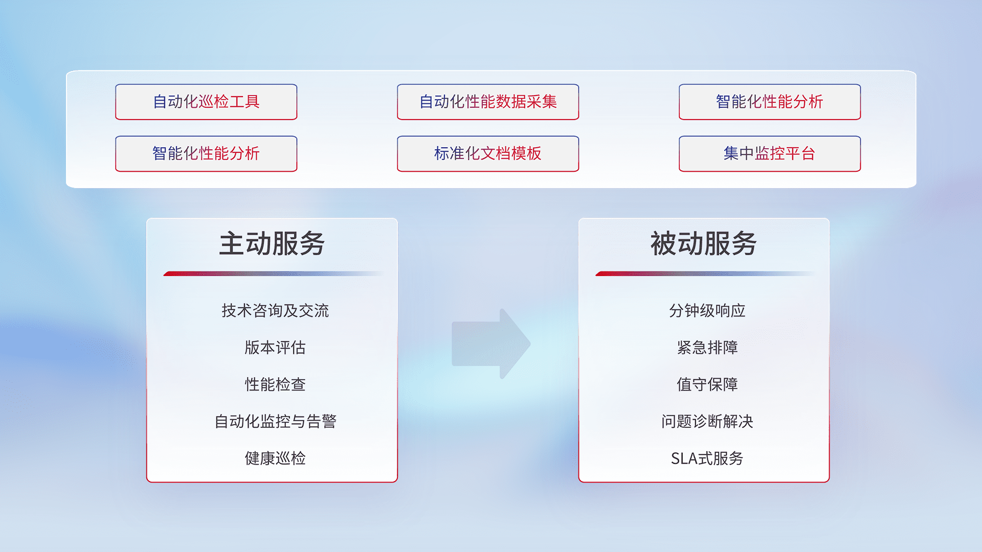智能化工具和标准化文档,,,,保障服务质量,,,提供主动服务(包含技术咨询、、版本评估、、、、性能检查、、自动化监控与告警、、健康巡检)和被动服务包含(分钟级响应、、、、紧急排障、、、值守保障、、问题诊断解决、、SLA服务)。。。。