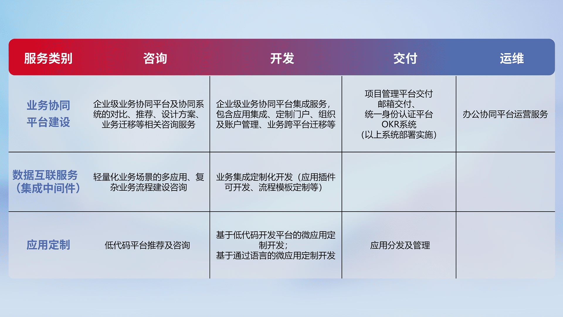 针对钉钉、、、企微、、、、IDaas等平台级产品提供产品的规划、、方案、、交付、、定制化开发等服务,,实现如统一协同办公、、、、智能客户服务、、、混合会议管理、、、智能数据查询、、、等业务场景,,,,实现数字化转型。。。。